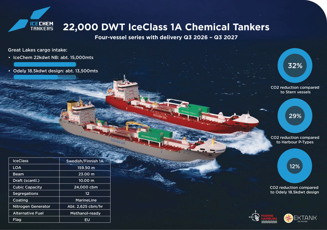 IceChem Tankers介绍,新造船将使 IceChem Tankers 能够提供进出五大湖地区的最高货物装载量——这是 IceChem Tankers 的核心业务。Seaway航线的货运量最高可达1.5万吨,该公司称这将为客户带来规模经济效益。