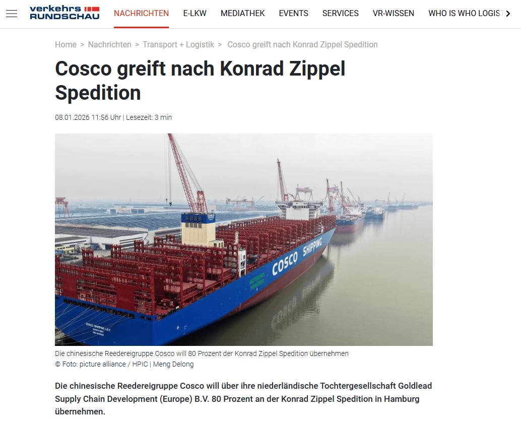 据德国及欧洲多家媒体近期报道,中远海运正在通过其新设立的荷兰子公司 Goldlead Supply Chain Development (Europe) B.V.,拟收购汉堡物流企业 Konrad Zippel Spediteur GmbH 的 80% 股权,交易目前仍处于监管审查阶段。这起看似“单一公司并购”的动作,如果与中远海运近年在欧洲的港口与网络布局放在同一框架下解读,更像是一次明确的战略延伸:从港口端的股权进入,进一步走向腹地端的运力与组织能力整合,目的在于提升全程供应链管理能力,为客户提供更可预期、更具韧性的物流服务。